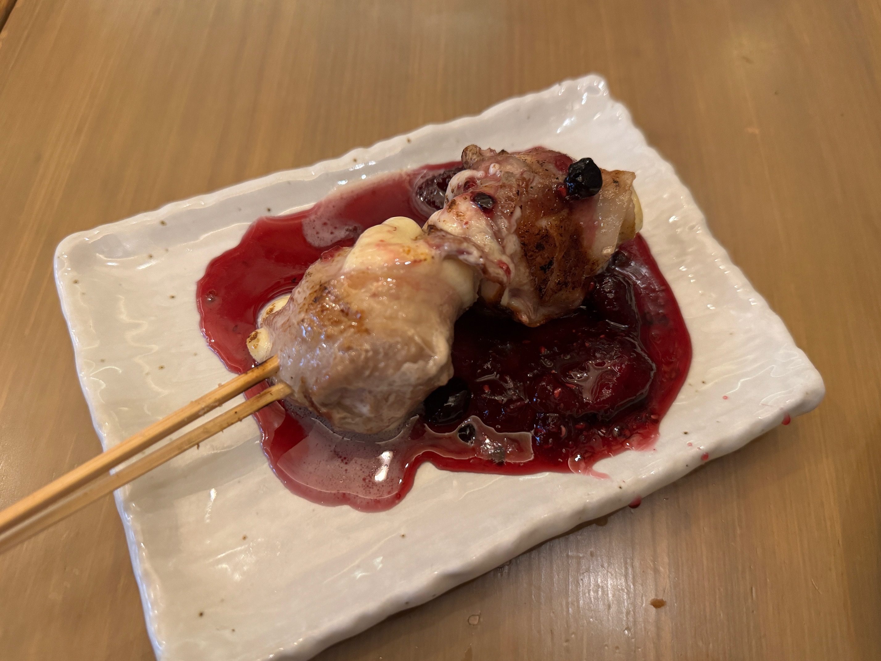 요런 파격적인 메뉴도 시켜봅니다. 모짜렐라 치즈를 얇은 베이컨으로 말아서 베리 소스를 뿌린 꼬치구이예요.