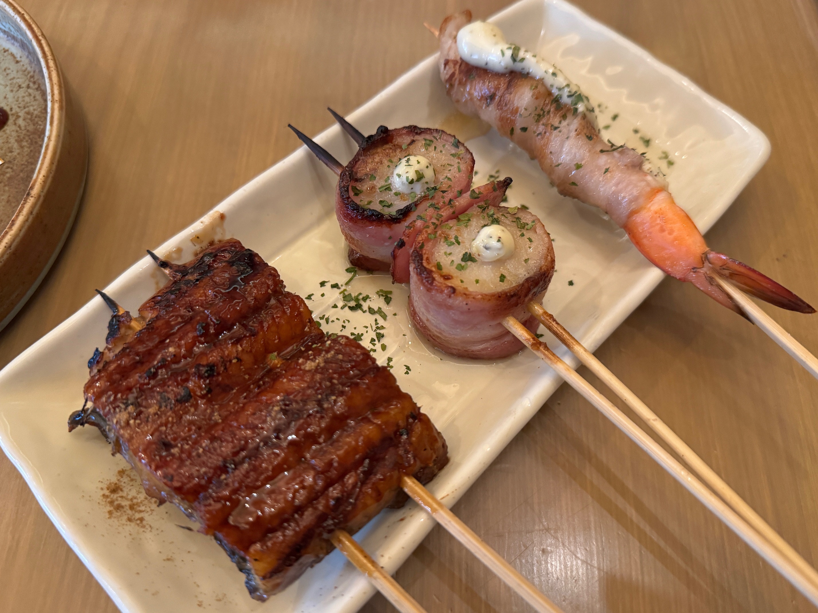 오마카세 파이브라고 세트메뉴랑 이것저것 시켜봅니다. 오마카세 파이브는 셰프 추천으로 5개 꼬치를 만들어주는 건데요. 빨리 준비되는 것부터 가져다주네요. 주인장이 장사 솜씨가 정말 좋으신 거 같아요. 한꺼번에 여러 개 팔아서 좋고 나가는 속도도 마음대로 조절할 수 있어 꼬치구이 집의 단점을 보완하는 좋은 메뉴더라고요.
