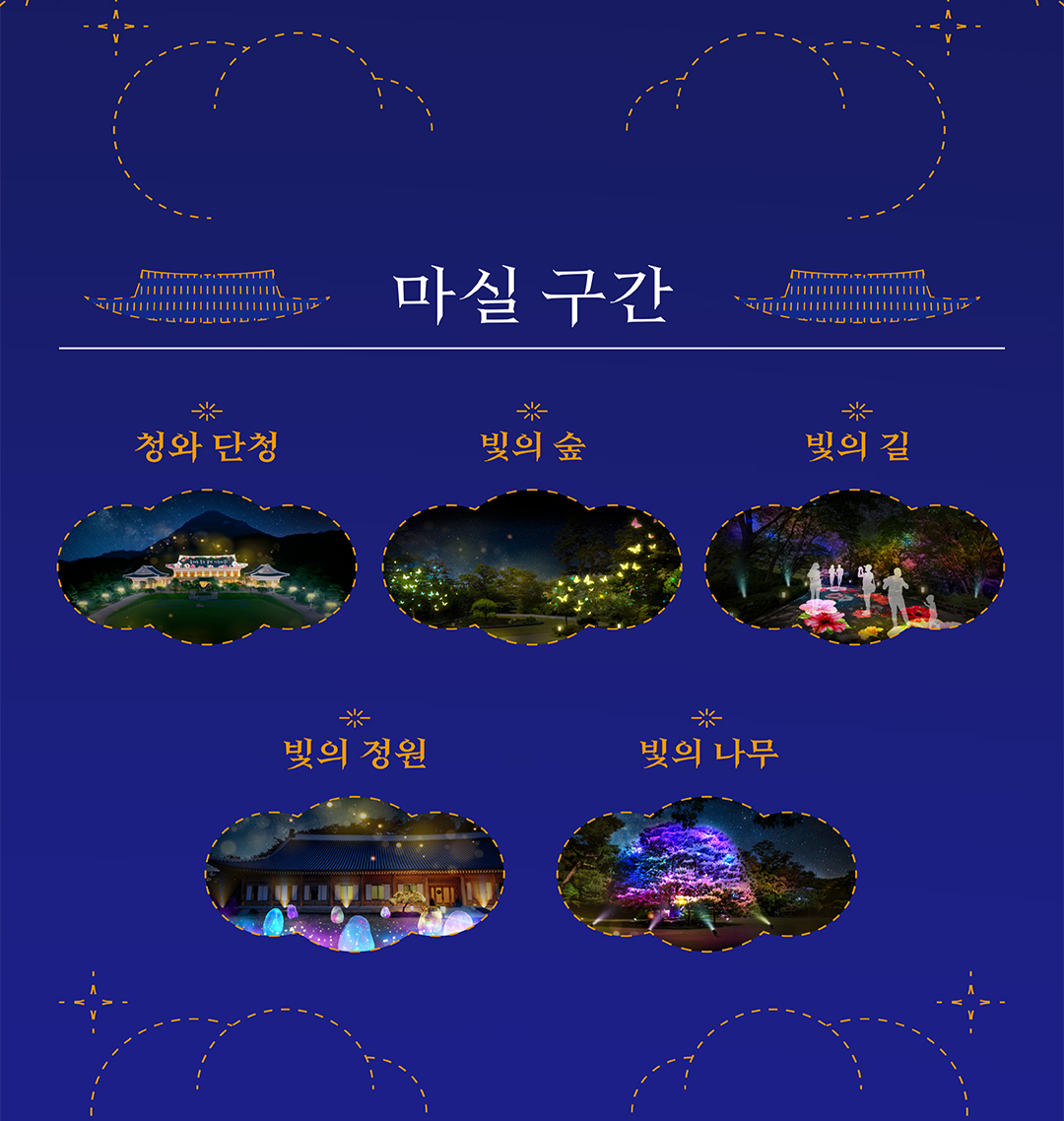 '청와대 밤마실'에서는 청와대 곳곳이 예술적인 빛으로 변신합니다. 본관은 한국 전통 문양을 활용한 '청와단청' 조명으로 화려하게 장식되며, 관람객의 움직임에 반응하는 '빛의 길', 자연을 느낄 수 있는 '빛의 숲', 음악과 조명이 어우러진 '빛의 정원' 등 다양한 빛의 설치물이 청와대를 새롭게 탈바꿈시킵니다.