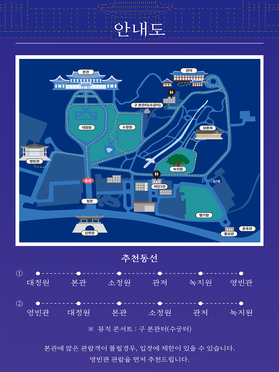 1. 주차장에서 청와대까지는 오르막길이 있으니 편한 신발을 착용하는 것이 좋습니다.
