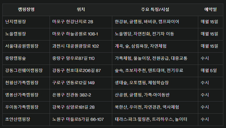 서울에는 도심 속에서 자연을 만끽할 수 있는 다양한 캠핑장이 마련되어 있어, 초보부터 가족, 캠핑 마니아까지 모두 만족할 만한 선택지가 이렇게 많은데요. 잘 알아보시고 신나는 캠핑 즐기시기 바랍니다.