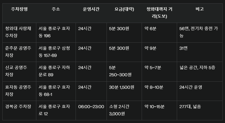 청와대 내에는 관람객용 주차장이 없으므로, 주변 공영주차장이나 유료주차장을 이용해야 합니다. 아래는 청와대와 가까운 주요 주차장 정보입니다. 모든 주차장은 유료이며, 무료주차장은 없습니다