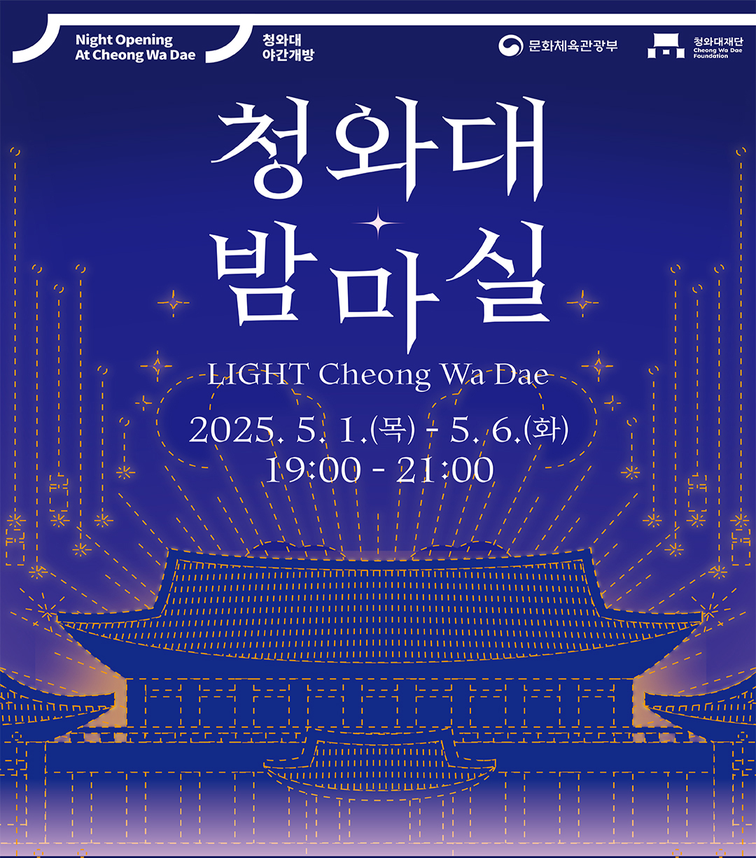 | 🌙 청와대 야간개방 행사 장 소 : 청와대 일원 (청와대 정문 입장) 기 간 : 2025년 5월 1일(목)~5월 6일(화) 시 간 : 19:00~21:00 (※ 입장마감 20:20) 회 차 : 1회차(19시 2,500명) / 2회차 (20시 1,500명) |